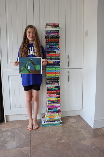 The grand prize was Isla's height in books, which she excitedly received last week.